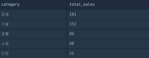 [문제 7] 2022년 1월의 카테고리 별 도서 판매량을 합산하고, 카테고리, 총 판매량 리스트를 출력하는 SQL문 작성. 결과는 카테고리를 기준으로 오름차순 정렬
