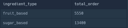 SELECT B.INGREDIENT_TYPE, SUM(A.TOTAL_ORDER) AS TOTAL_ORDER