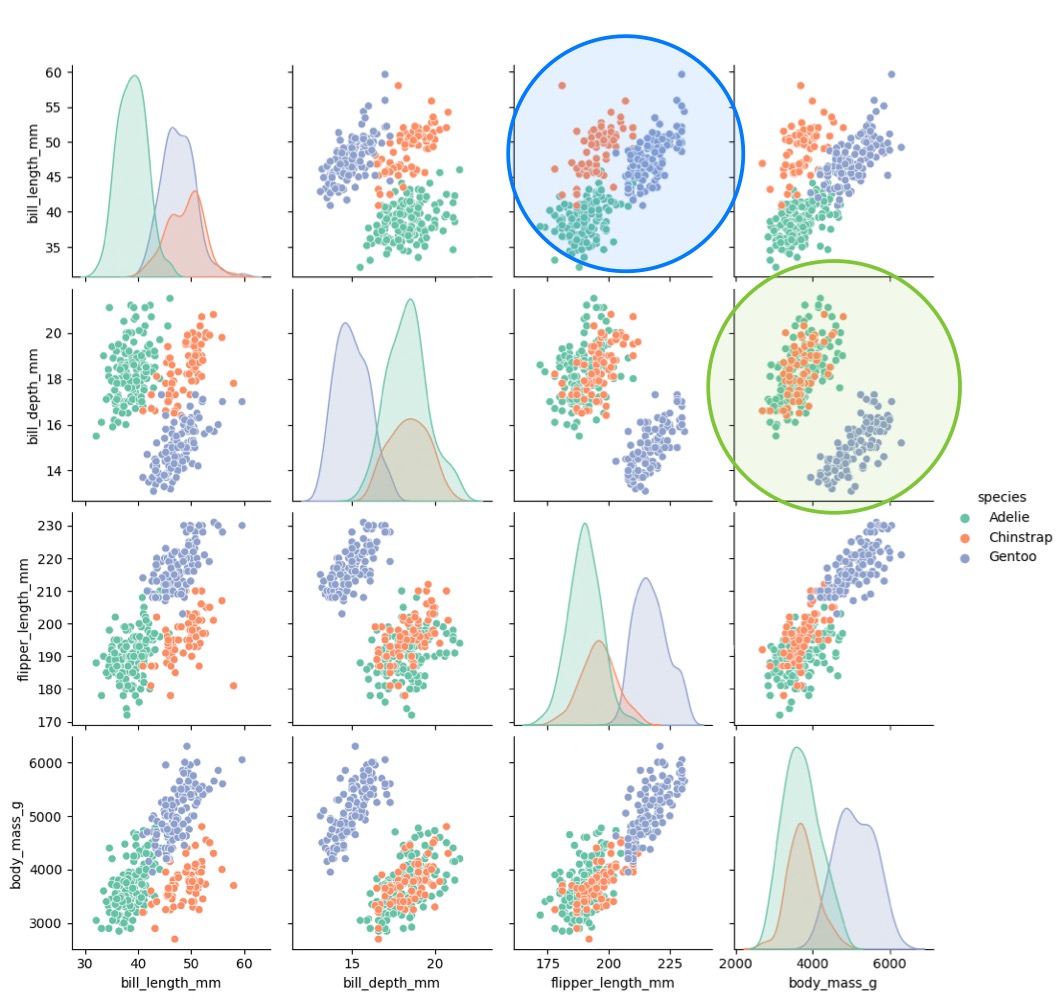 우선, 몸무게와 부리 두께 사이의 그래프를 보면 adelie와 chinstrap은 유사하지만 gentoo 종의 경우 확실하게 구분되어 있는 걸 확인할 수 있습니다. 이를 통해 몸무게와 부리 두께에 대한 정보를 알고 있다면 gentoo 종을 분리하는 게 가능하겠네요.