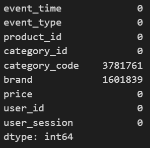 category_code, brand 컬럼에 상당수의 결측치가 존재하네요. 이번 분석에서는 카테고리나 브랜드에 따른 분석을 진행할 계획이 없음으로 두 컬럼을 제거하겠습니다.