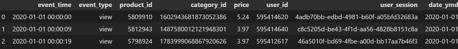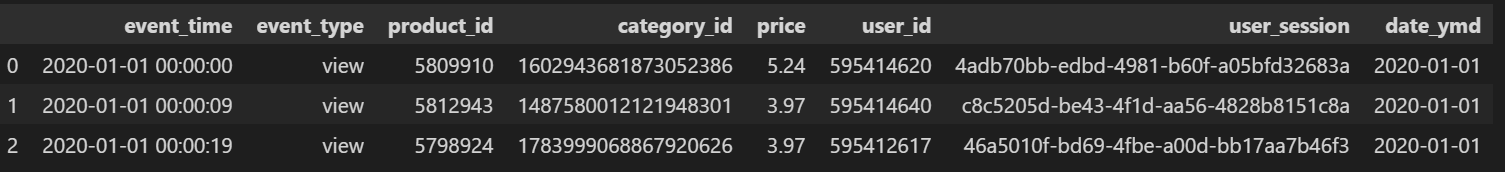 분석의 편의를 위해 event_time변수에서 시간을 제거하고 날짜만 추출해서 date_ymd라는 변수를 생성하겠습니다.