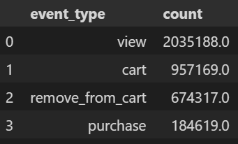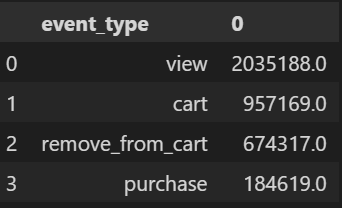 각 이벤트 타입별 카운트를 진행한 후, 데이터 프레임 형식으로 저장하겠습니다.