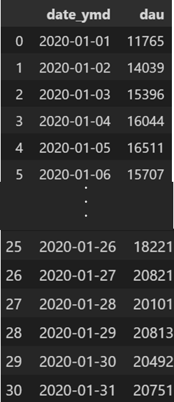 dau = data.groupby('date_ymd')['user_id'].nunique().reset_index().rename({'user_id': 'dau'}, axis = 1)