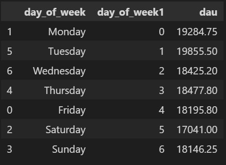 avg_dau_by_dow = dau.groupby(['day_of_week', 'day_of_week1'])['dau'].mean().reset_index()