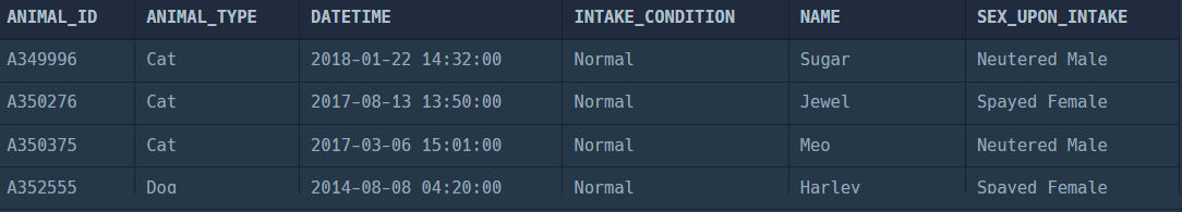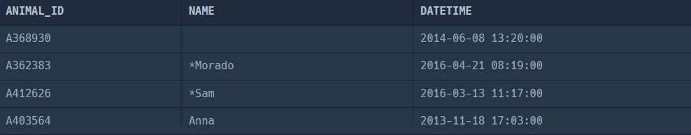SELECT ANIMAL_ID, NAME, DATETIME