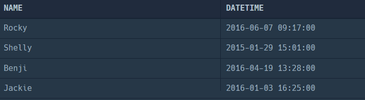 SELECT NAME, DATETIME
